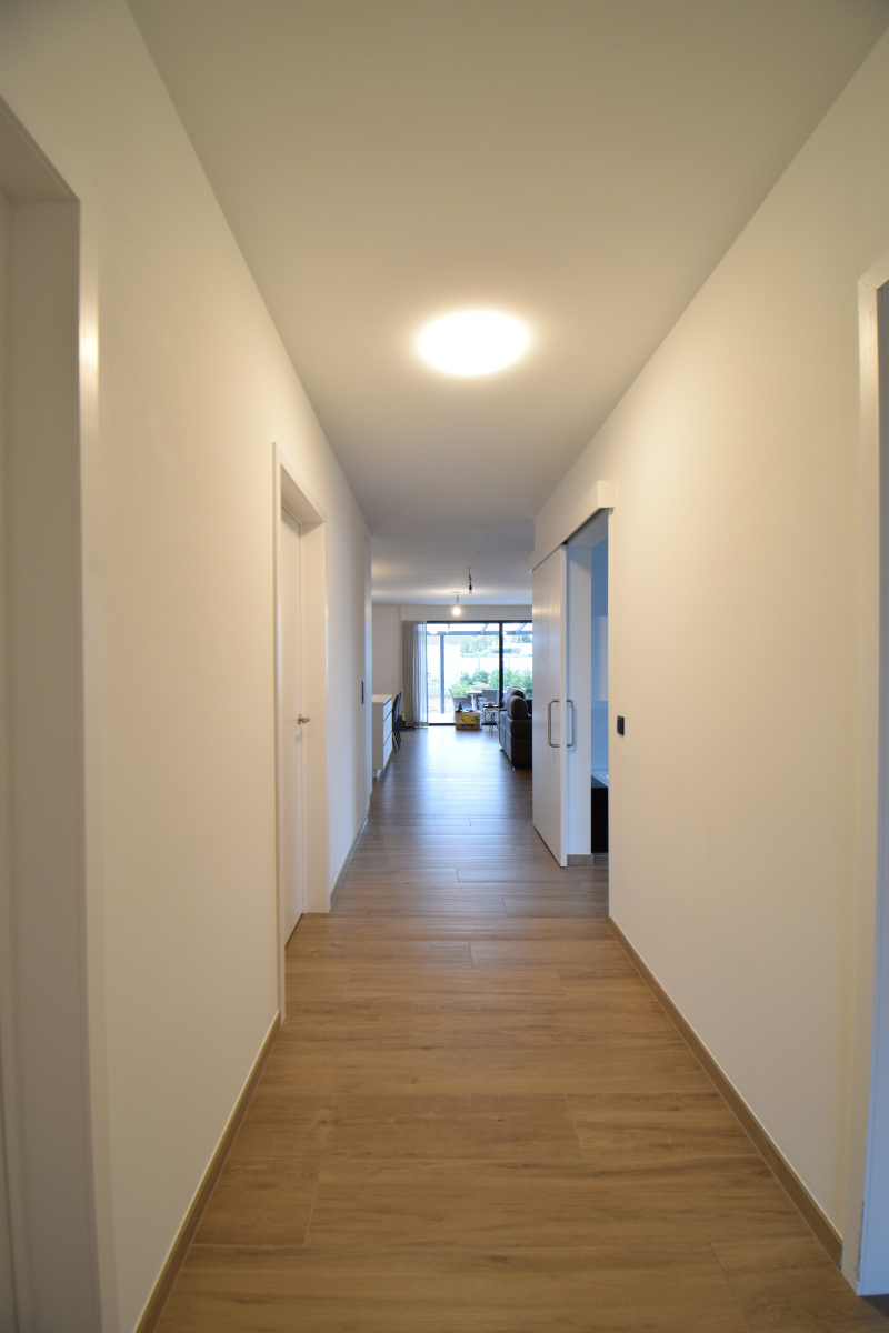 De leefruimte geeft via een deur en schuifraam uit op een groot overdekt terras achteraan.