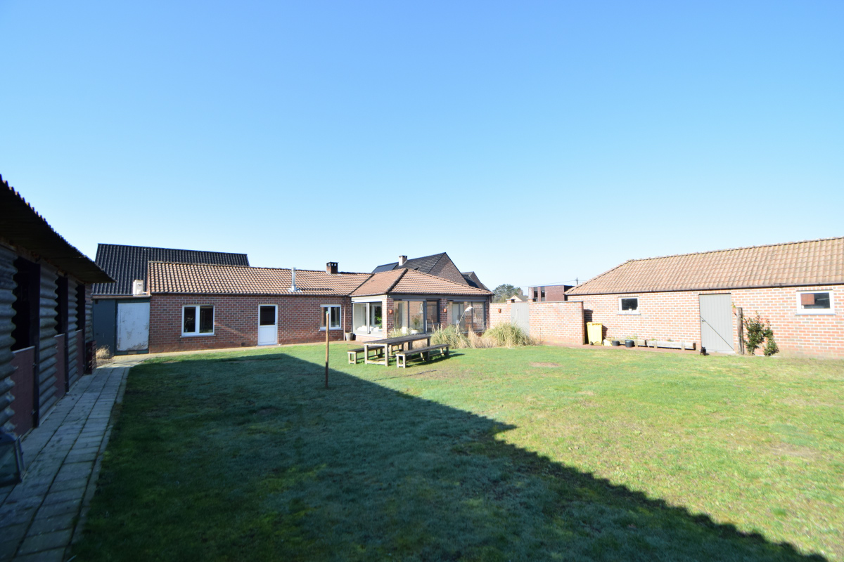 De woning geeft uit op een binnentuin die aangelegd is met gazon, vooraan afgesloten door een muur en grote garage met werkhuis en achteraan met berghokken.