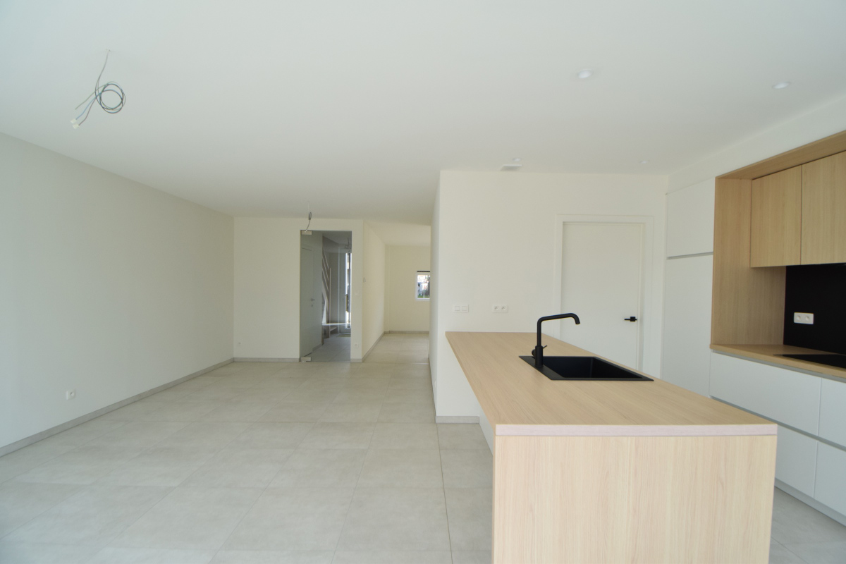 Indeling: inkomhal met gastentoilet en trap naar de bovenverdieping. De inkomhal geeft uit op een leefruimte bestaande uit een zithoek vooraan en een eethoek achteraan met volledig geďnstalleerde open keuken met ontbijthoek die via een schuifraam uitgeeft op het terras en de tuin achteraan. Aansluitend is er een wasruimte met een achterinkom.