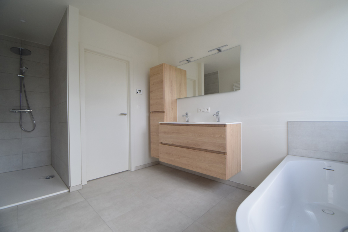 Op de eerste verdieping is er een trap naar de bovenverdieping en een badkamer met dubbel lavabomeubel, grote inloopdouche, toilet en ligbad, 2 ruime slaapkamers waarvan één master bedroom.