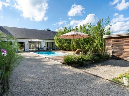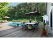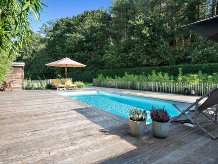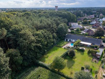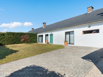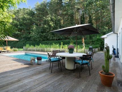 Zeer rustig gelegen stijlvol landhuis met 2 (mogelijkheid tot 5) slaapkamers op een perceel van 1.632 m². Hoogwaardig afgewerkt in een mix van scandinavische en mediterraanse stijl.De inkomhal met ingemaakte vestiairekast en apart gastentoilet geeft uit op de leefruimte bestaande uit een grote zithoek en eethoek met massieve parketvloer, een schouw in tadelakt met haardcasette en grote glaspartijen met zicht op het terras, zwembad en de tuin.