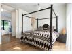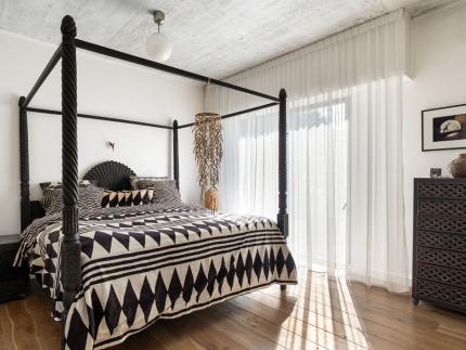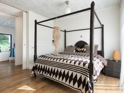 Aanpalend aan de badkamer is er een master bedroom met ingemaakte kasten. Achteraan is er een zeer ruime slaapkamer met dressing, grotendeels afgewerkt in naadloze pleister, momenteel dienstdoende als praktijkruimte. Er is ook een aparte ingang mogelijk waardoor deze ruimte potentieel interessant is als bureau- of hobbyruimte zeker in combinatie met de bovenverdieping. In de kastenwand is aansluiting voor wasmachine en droogkast voorzien.