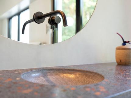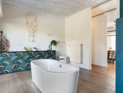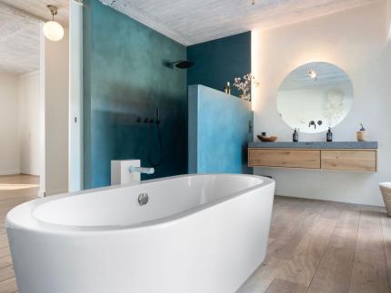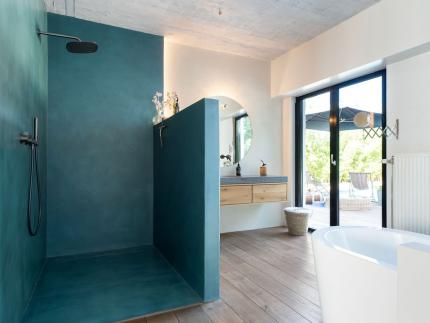 De nachthal geeft uit op een prachtige badkamer met vrijstaand bad, toilet, grote inloopdouche in beton ciré, lavabomeubel en wastafel in terrazzo en zicht op de tuin.