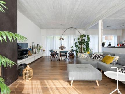 | Living | 54,18 m² | Grote leefruimte bestaande uit een grote zithoek en eethoek met massieve parketvloer, een schouw in tadelakt met haardcasette en veel lichtinval dankzij de grote glaspartijen met zicht op het terras, zwembad en de tuin. |