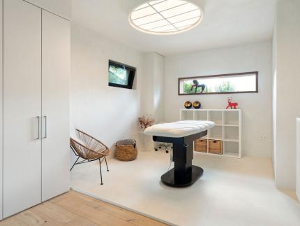 | Slaapkamer 2 | 34 m² | Zeer ruime slaapkamer met dressing, grotendeels afgewerkt in naadloze pleister, momenteel dienstdoende als praktijkruimte. |