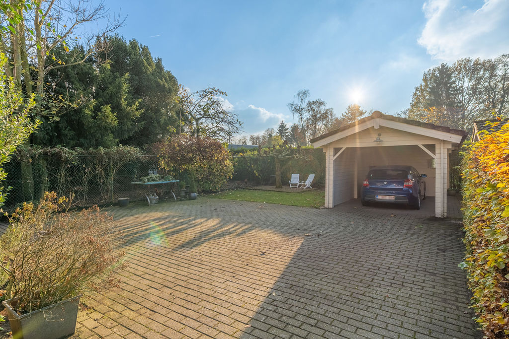De tuin is afgesloten met een elektrische poort en achteraan in de tuin staat een carport en tuinhuis.
