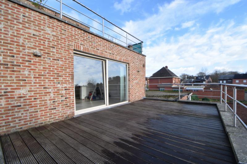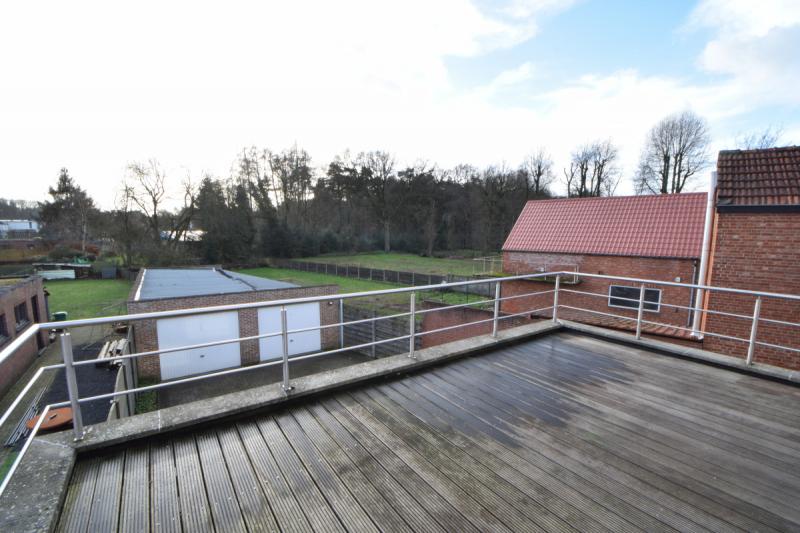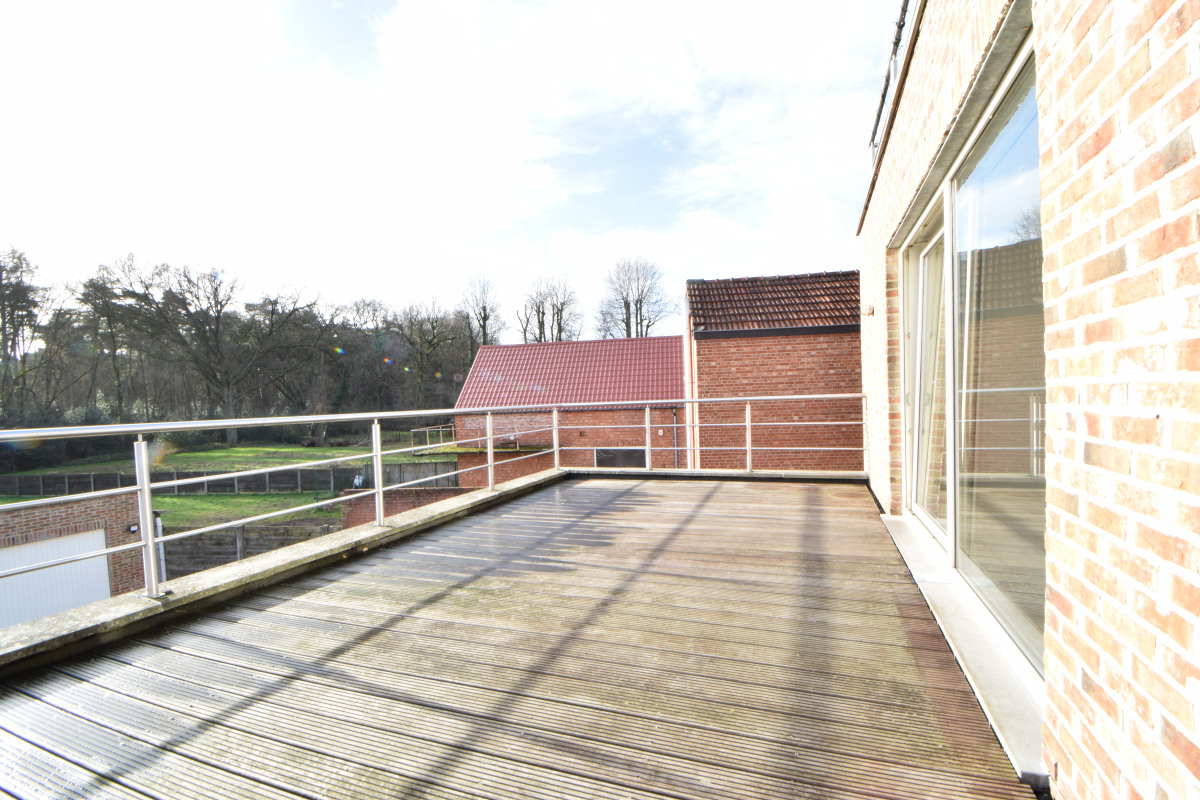 Achteraan geeft de leefruimte via een schuifraam uit op het groot dakterras met mooi uitzicht. In het bos achteraan zijn ook diverse wandel- en mountainbikeroutes.