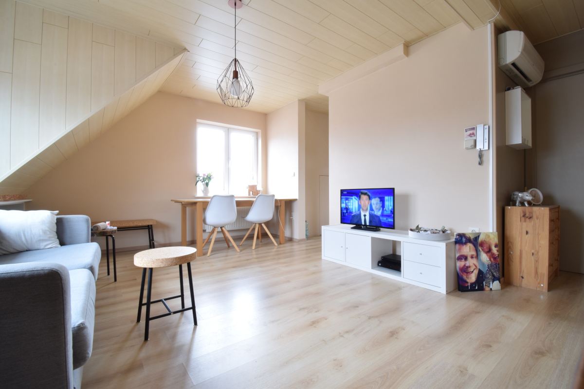 Knusse studio / dakappartement op de tweede verdieping met één slaapkamers en autostaanplaats, gelegen in het centrum van Tielen.GEEN gemeenschappelijke kosten.