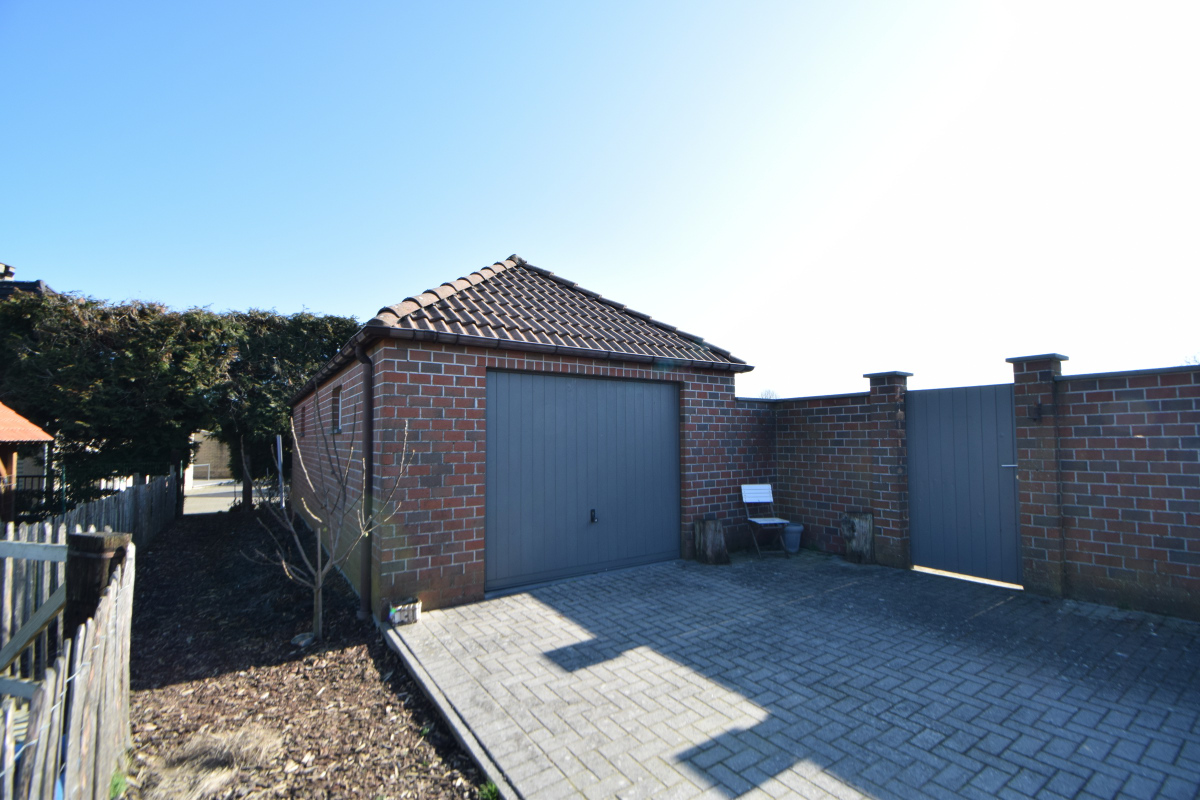 De woning geeft uit op een binnentuin die aangelegd is met gazon, vooraan afgesloten door een muur en grote garage met werkhuis en achteraan met berghokken.