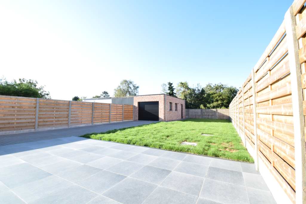 In de tuin staat een grote garage met elektrische poort, de tuin wordt aangelegd let gazon.