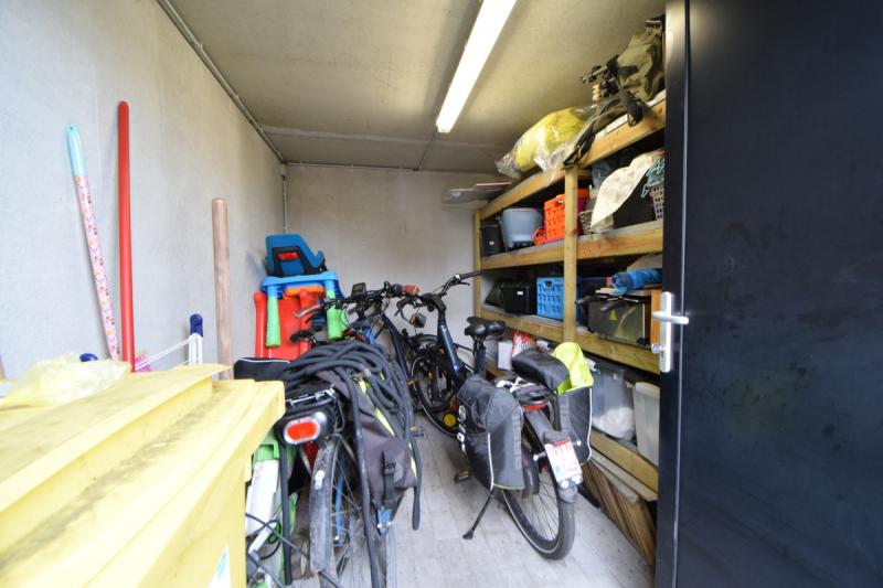 Ter hoogte van de keuken is er een dubbele achterdeur die uitgeeft op het terras en de omheinde, onderhoudsvriendelijke tuin met achterpoortje. Een zonneluifel zorgt voor extra comfort op warme dagen en de tuinberging biedt handige opbergruimte.