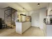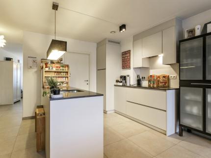 Vooraan is er een eetkamer met een op maat gemaakte keuken, volledig ingericht en hoogwaardig afgewerkt (inbouwijskast, vaatwasser, oven en werkblad uit natuursteen) en aanpalend een berging/wasruimte.