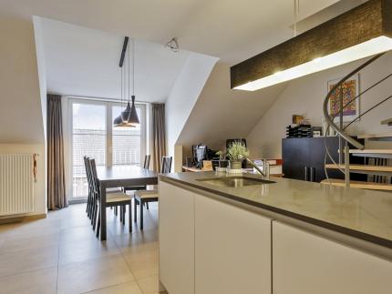 Het duplex (130,20mē) bestaat uit een inkomhal met gastentoilet, een ruime woonkamer die via een schuifraam uitgeeft op een dakterras (11,15mē) georienteerd naar het zuiden.