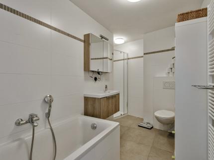 Onder dak zijn er 2 slaapkamers en een ruime badkamer met lavabo, toilet, ligbad en een grote inloopdouche.