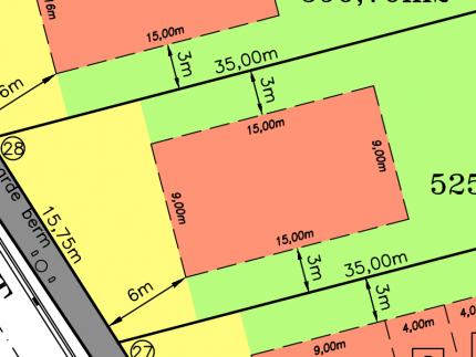 Bebouwbare voorgevelbreedte 9 meter, bouwdiepte gelijkvloers 15 meter.